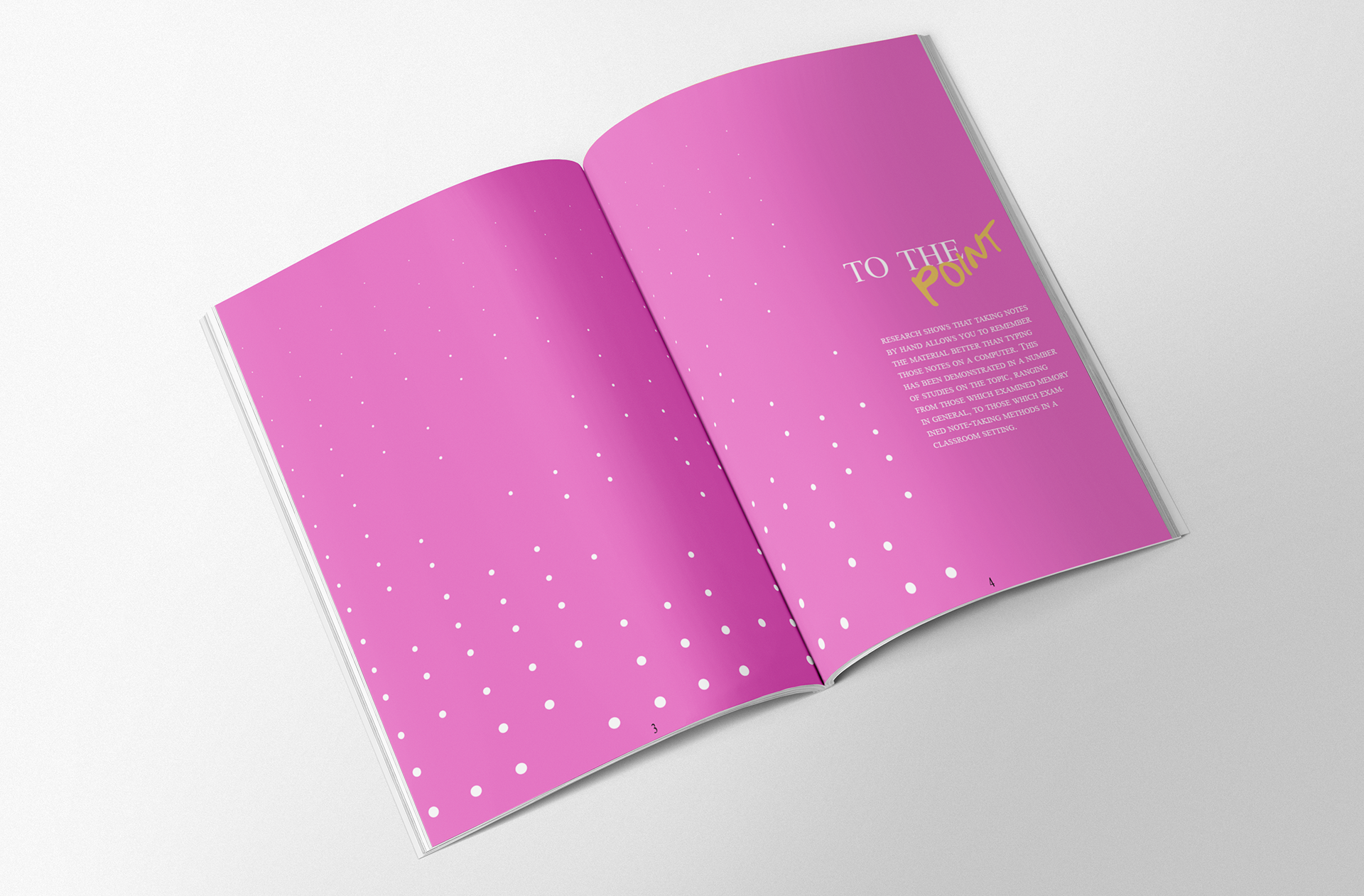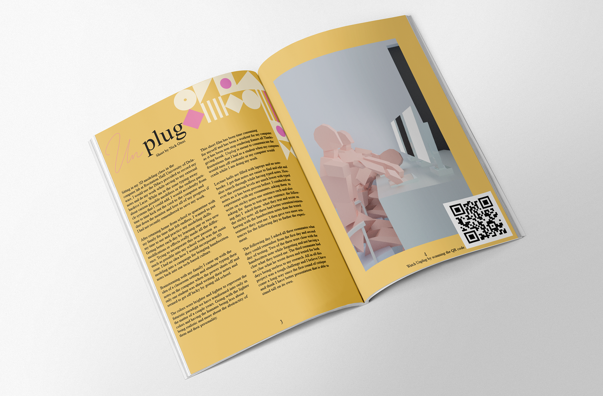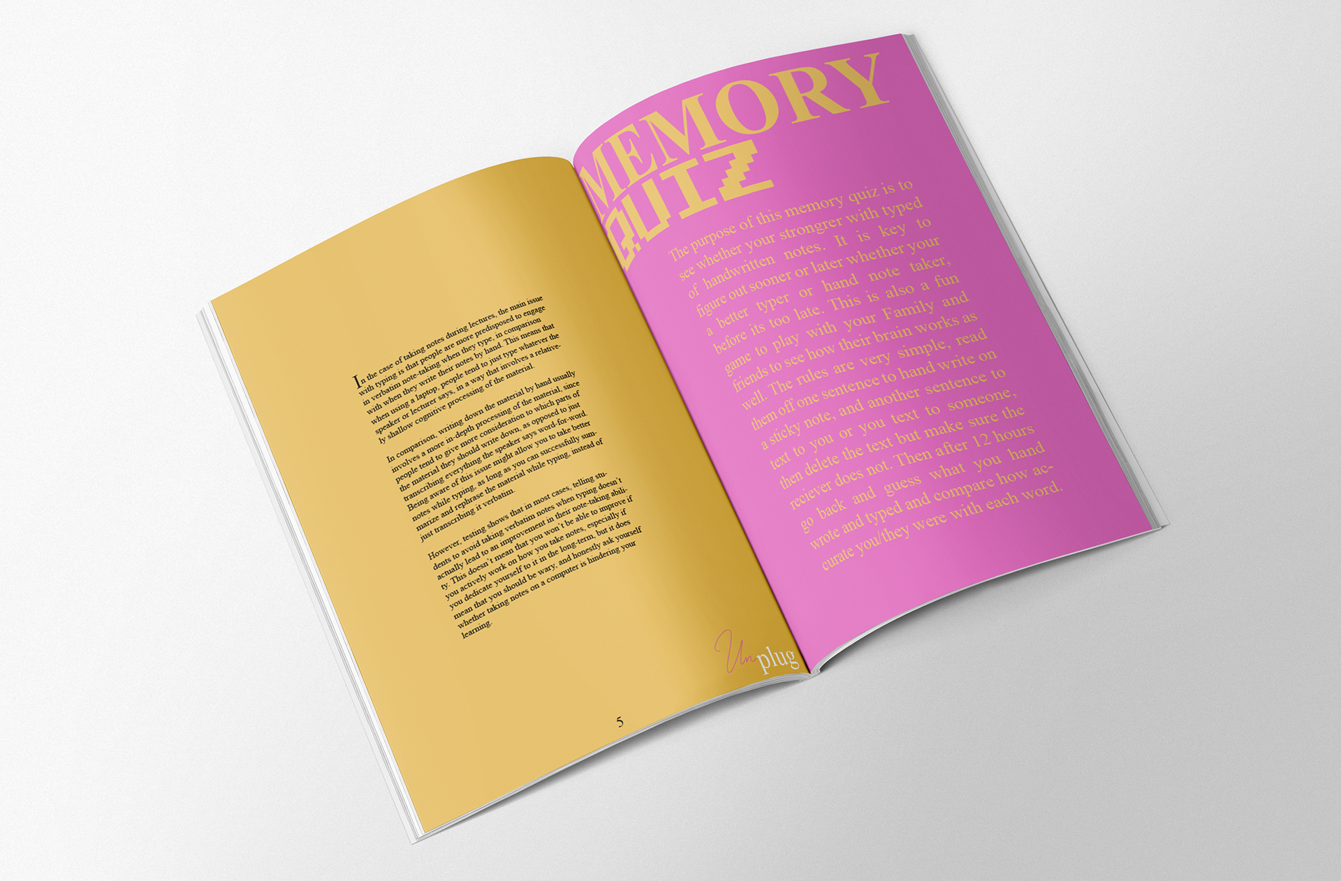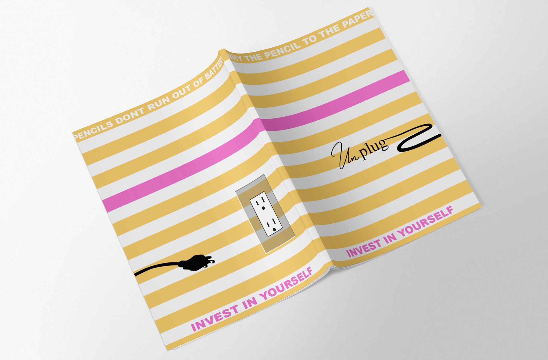 Unplug is an attempt to identify what needs changing in society today. Students are migrating into digital notes rather than paper notes. I provided a zine spread and animated short persuading note typers to go back to handwriting it out.
